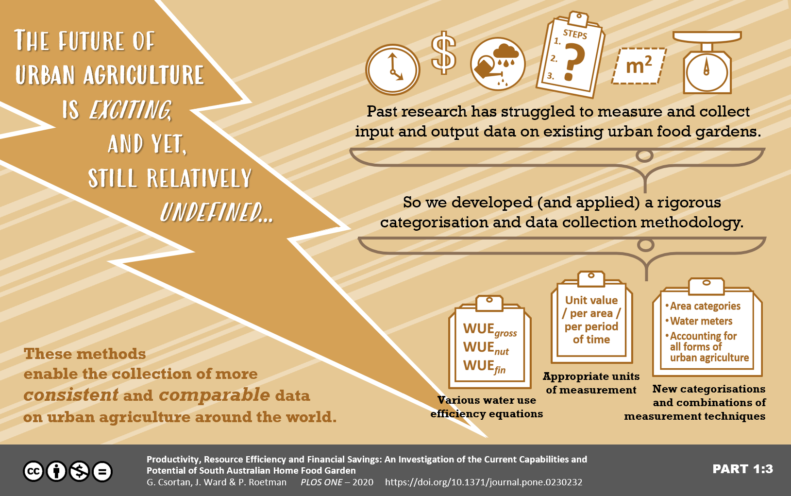 My reasoning was that this particular paper was the summation of my PhD research and so as you can imagine – quite detailed. But it also resulted in 3 distinct sets of findings: methodology, new open-access data and implications for urban food growers. Thus when it came time to design a graphical abstract for this paper I could not find a way to mesh these three stories together in a simple visual way.
